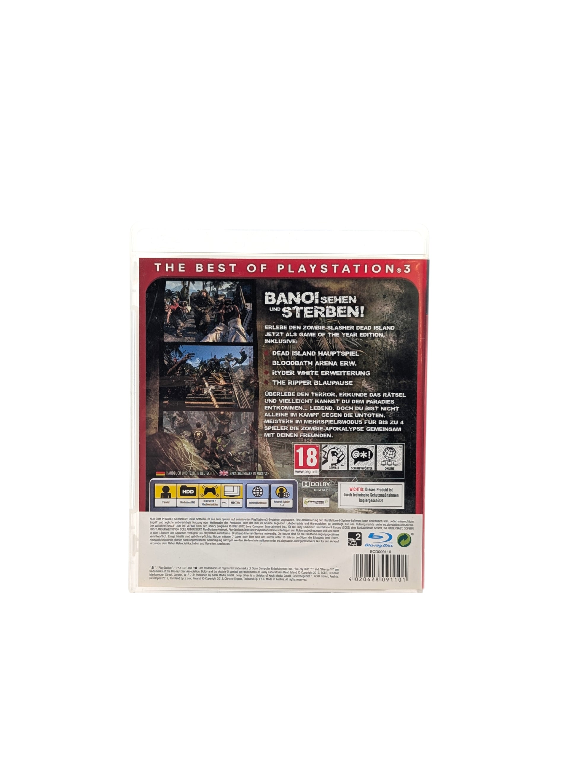 In Dead Island für die PlayStation 3 kämpfst du ums nackte Überleben in einem tropischen Urlaubsparadies, das von einer Zombie-Apokalypse heimgesucht wird. Stelle dich der offenen Spielwelt, rüste dich mit selbstgebauten Waffen aus und erlebe spannende Kämpfe gegen blutrünstige Untote. Dank Koop-Modus, packender Atmosphäre und Rollenspiel-Elementen bietet Dead Island ein intensives Action- und Survival-Erlebnis.