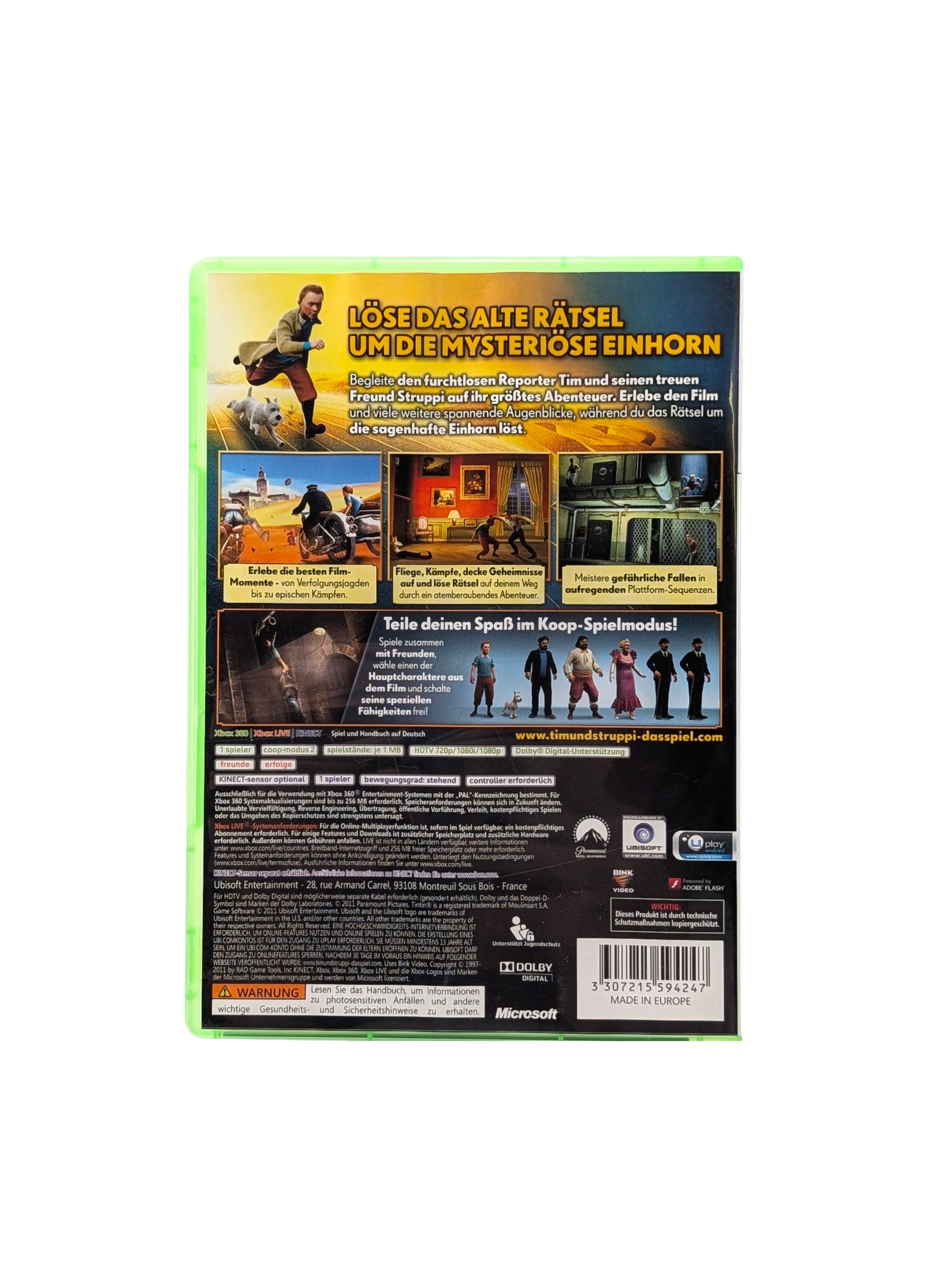 Begleite den jungen Reporter Tim, seinen treuen Hund Struppi und Kapitän Haddock auf einer spannenden Schatzsuche voller Abenteuer! Inspiriert vom Kinofilm erleben Sie actionreiche Missionen, knifflige Rätsel und spannende Kämpfe an exotischen Schauplätzen. Dank abwechslungsreicher Gameplay-Elemente, die sowohl Geschick als auch Köpfchen fordern, ist das Spiel perfekt für Fans der Serie und Abenteurer jeden Alters. Kinect-Sensor wird unterstützt, ist aber nicht zwingend erforderlich.