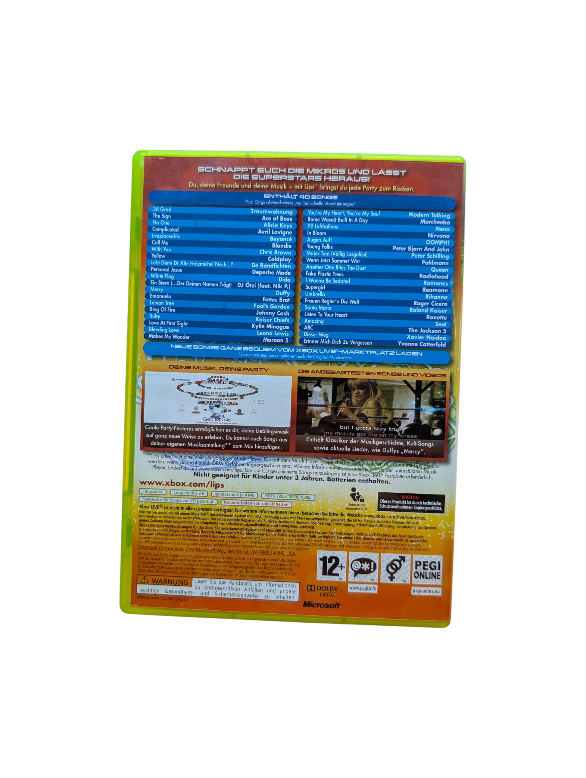 Lips ist ein unterhaltsames Karaoke-Spiel für die Xbox 360, das jede Party in Stimmung bringt. Singe alleine oder im Duett zu bekannten Songs und fordere Freunde im Mehrspielermodus heraus. Dank einfacher Bedienung und spaßiger Spielmodi eignet sich Lips perfekt für gesellige Abende.
